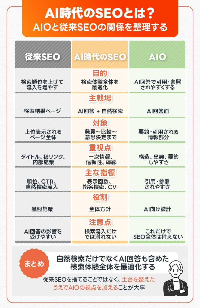 ここでは、AI時代のSEOとAIO、従来SEOの違いや関係について解説していきます。