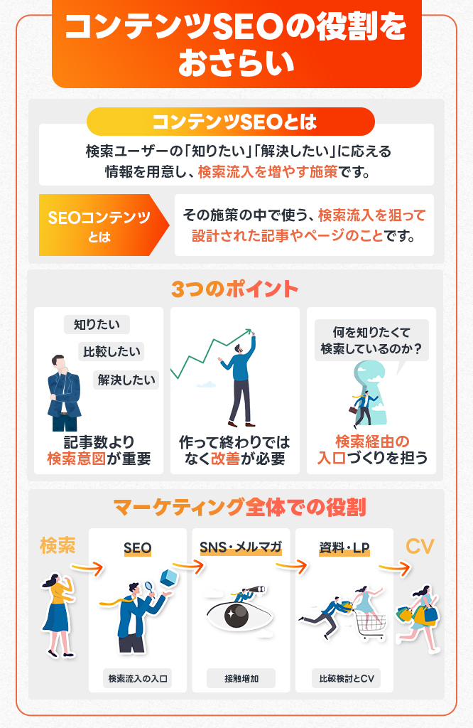 コンテンツSEOの本質は、検索ユーザーの「知りたい」「解決したい」に答える情報を用意し、検索結果からの流入を積み上げていくことです。