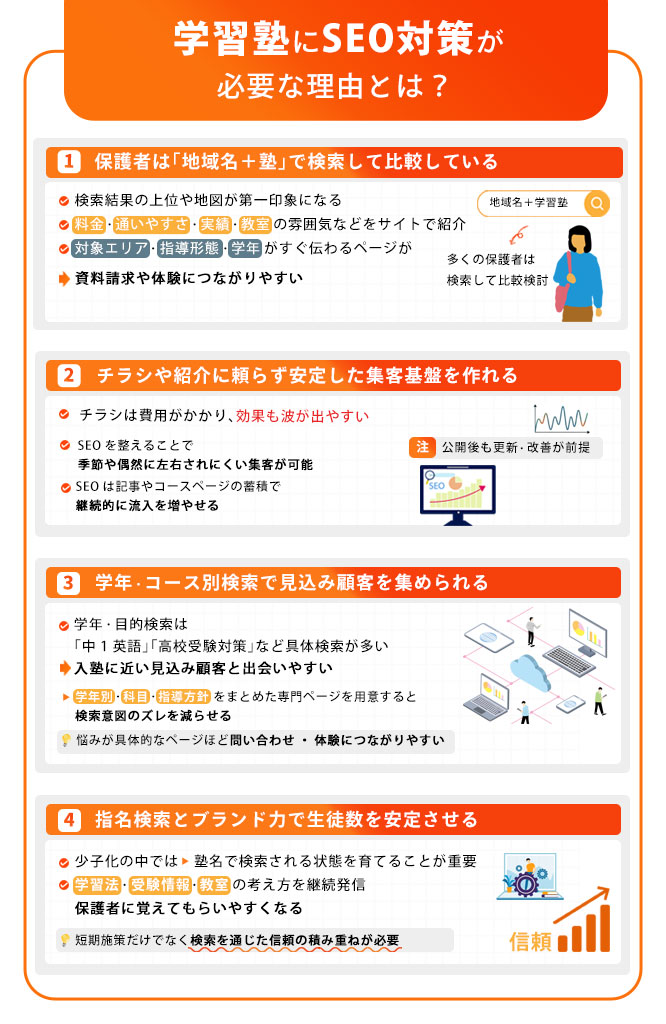 学習塾の集客は、近くで信頼できる塾を探したい保護者の検索行動と相性がよく、早い段階で取り組んでおきたい施策です。