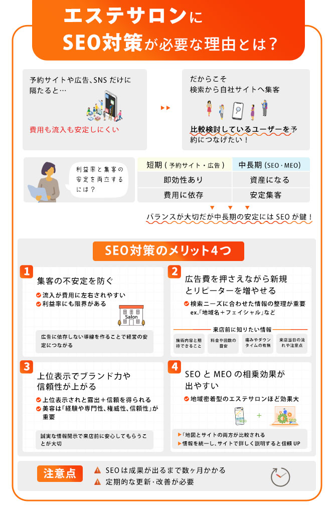 エステサロンのSEOは、広告や予約サイトへの依存を減らしながら、検索からの集客と予約につながる流れを育てていくための土台です。