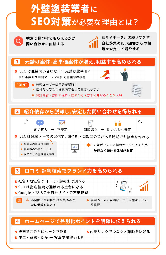 ここでは、外壁塗装業者にSEOが必要な理由と、取り組むことで得られる主なメリットを整理します。