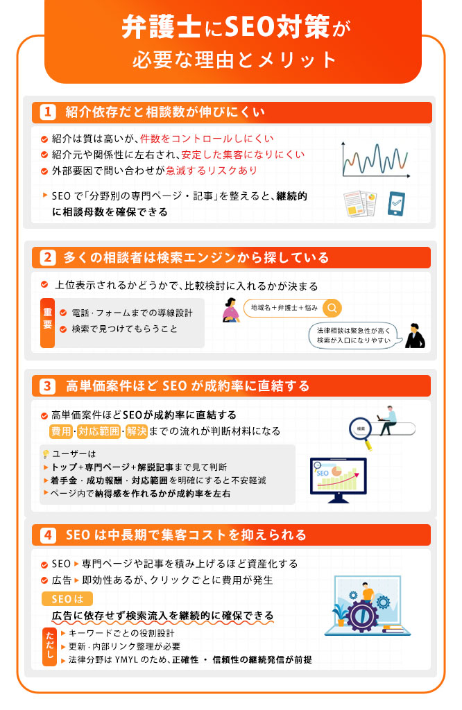 そのなかでSEOは、検索を通じて新しい相談者と出会うための土台になります。