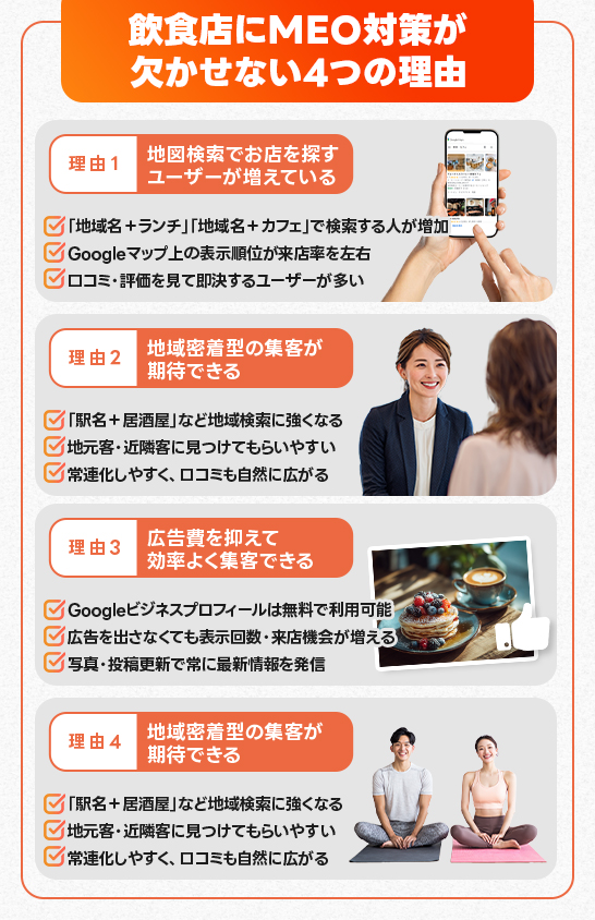 飲食店にとってMEO対策はどのようなメリットをもたらすのか、具体的に見ていきましょう。
