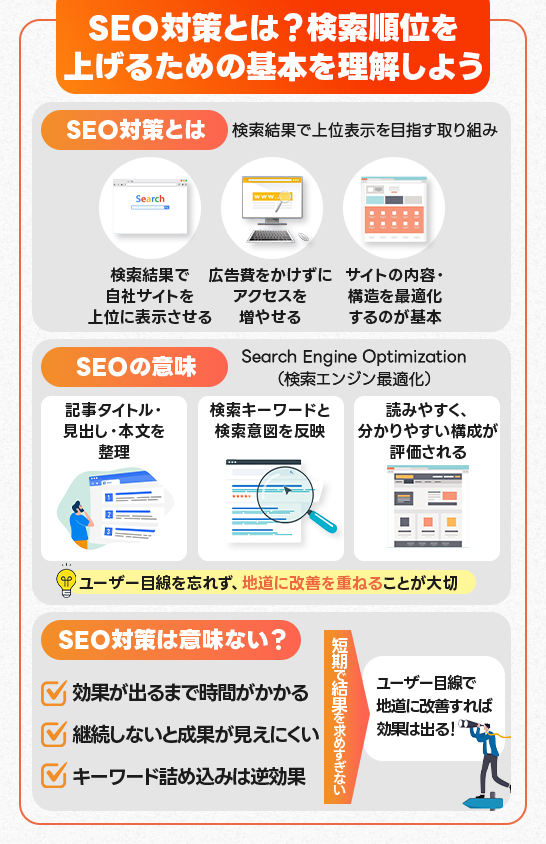 SEO対策は広告費をかけずに集客できますが、効果が出るまで時間がかかるため「意味がない」と思う人も。ここではそういったケースの回避策もお伝えします。